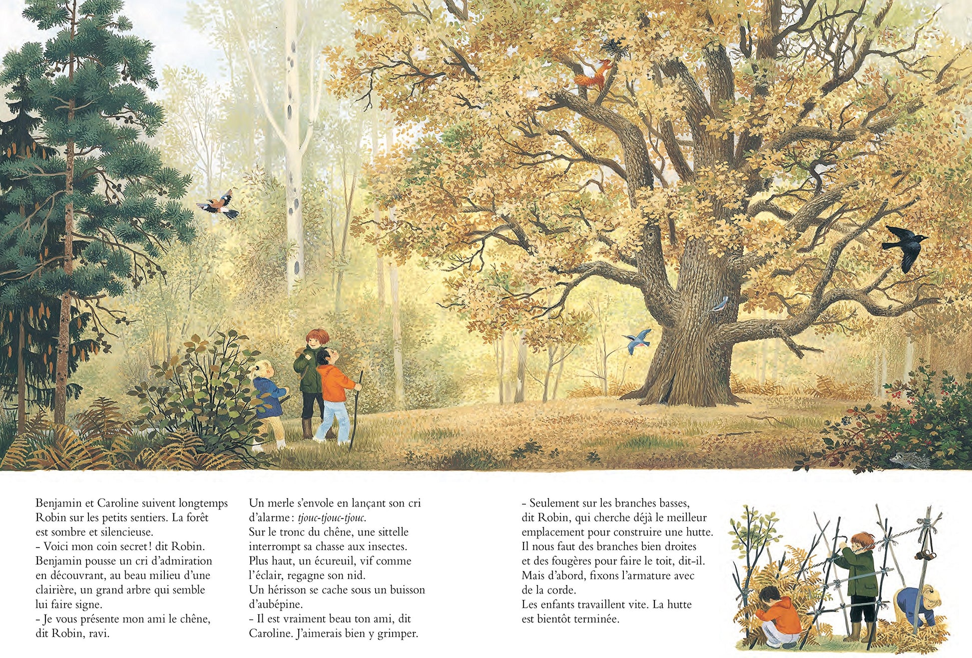 Benjamin et Caroline adorent séjourner chez leur cousin Robin dans sa maison près de la forêt. À l'automne, Robin les emmène voir son arbre préféré, un chêne géant de 300 ans. Les enfants construisent une tanière sous les branches géantes du chêne et regardent les écureuils cacher des glands dans son large tronc.